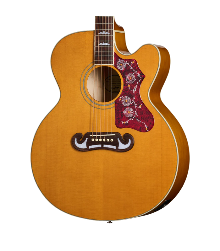 Epiphone J-200™ Studio EC dio je potpuno nove Epiphone Studio Acoustic kolekcije. Ove gitare su potpuno redizajnirane kako bi ponudile najautentičnije i najpristupačnije akustične gitare inspirirane kultnim Gibson dizajnom. J-200 Studio EC nudi spoj klasičnog dizajna i moderne funkcionalnosti te je dizajniran da privuče podjednako početnike i iskusne svirače. Elektro-akustična gitara Epiphone J-200 Studio EC je ugledan model, poznat po svom Super Jumbo tijelu i izvanrednoj projekciji zvuka. Inspirirana legendarnim Gibson SJ-200, "Kraljem Flattop gitara", ova gitara se može pohvaliti izrezom za poboljšani pristup gornjim pragovima. J-200 Studio EC ima slojevito tijelo od javora s četveroslojnim vezom na vrhu, jednoslojnim vezom na stražnjoj strani, prstohvatu i na glavi, te čvrstu smrekovu gornju ploču za responzivan, uravnotežen ton s izvrsnim dinamičkim rasponom koji će s vremenom zvučati još bolje. Vrat od mahagonija spojen je s tijelom zalijepljenim, suženim spojem u dovetail obliku i ima SlimTaper™ D profil iz 1960-ih koji ga čini ugodnim za sviranje. Vrat ima prstohvat od palisandera opremljenim s 20 standardnih pragova i ukrašenim bisernim graduiranim krunskim intarzijama. Drugi krajevi žica su usmjereni preko kompenziranog plastičnog sjedišta i pričvršćeni su za Moustache™ most od palisandera s pinovima od slonovače s crnim točkama. Moustache most je ukrašen s četiri biserne intarzije.
