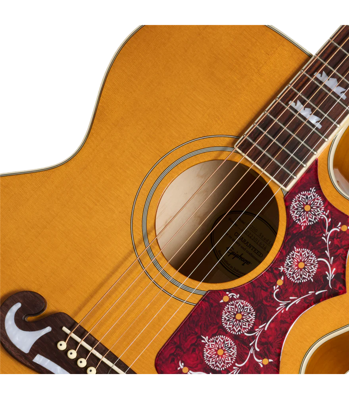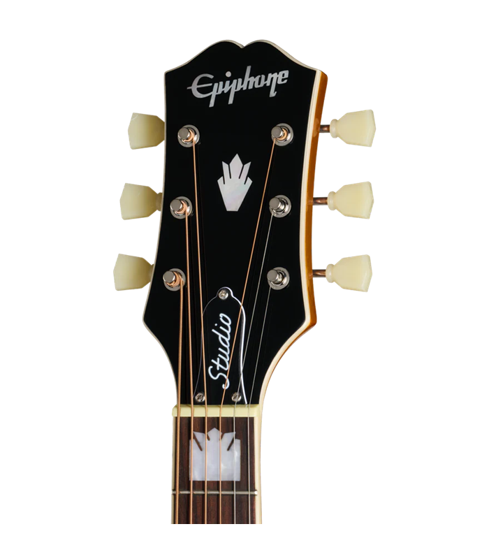 Također su uključene i druge značajke koje J-200 Studio EC daju još više vintage vizualnog šarma, uključujući kultni tortoise shell pickguard u stilu J-200 s klasičnim dvobojnim J-200 grafikama, Epiphone Deluxe navijače s Keystone kapicama i vezan headstock u stilu Kalamazoo iz 60-ih s Epiphone logotipom i Gibson Crown ponosno izloženim u sedefu. J-200 Studio EC dolazi s Fishman® elektronikom, uključujući S-Core pickup ispod sedla i Fishman Presys™ II pretpojačalo s bočnim kontrolama glasnoće, basa, visokih tonova i faze. Također ima praktičan ugrađeni elektronički štimer koji omogućuje brzo i jednostavno ugađanje. Epiphone J-200 Studio EC ima sjajnu završnu obradu. Uključena je i standardna navlaka za gitaru.