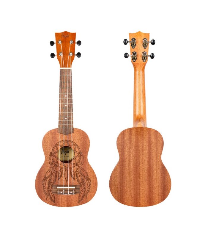 FLIGHT NUS350 DC je soprano ukulele, kvalitetom i izradom sličan modelu NUS310, ali uz predivno ugraviran "dreamcatcher" motiv. Izrađen je od sapelea, afričkog drveta srodnog mahagoniju. Vrat i prstohvat su izrađeni od okume i oraha. Zahvaljujući idealnoj kombinaciji kvalitetnog materijala koja jamči stabilnu intonaciju na svim poljima vrata, NUS350 je izuzetno ugodan za sviranje.