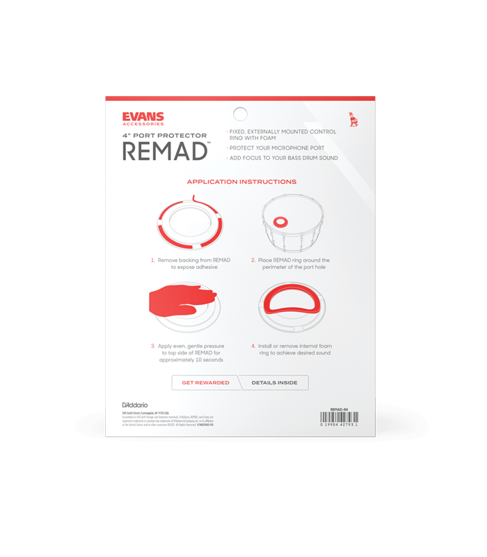Inspiriran legendarnim EVANS EMAD sustavom, REMAD je vanjski denfer za prigušivanje dizajniran za mikrofonske portove od 4" u rezonantnim plastikama bas bubnja. Primjenom REMAD prstena na mikrofonski port od 4" dobivate veću kontrolu nad prigušenim tonovima, tako da možete poboljšati visinu tona, fokus i attack. Svaki REMAD uključuje pjenasti prsten koji se može primijeniti ili ukloniti za dodatnu kontrolu zvuka.
