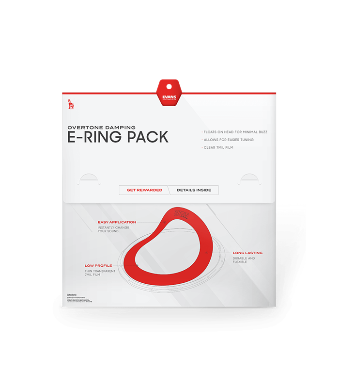 EVANS E-Ring paketi sadrže jednostavne vanjske prstenove za kontrolu prizvuka koji plutaju na površini plastike bubnja kako bi uklonili prizvuke i izgladili zvuk bubnja, omogućujući lakše ugađanje.